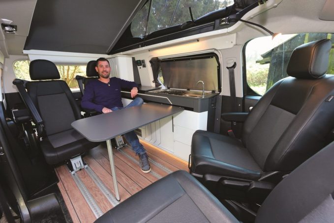 Bien que tout nouveau, le Cap Road reprend l’implantation du Cap Coast sur base Ford Transit Custom. Livré d’office en six places carte grise, il ne dispose cependant que de deux sièges arrière de série (plus les sièges de cabine pivotants). Il faut donc piocher dans le catalogue des options pour en ajouter deux places (1 100 € l'unité). Les assises sont montées sur des rails qui leur permettent de coulisser et d’offrir une belle modularité. Le mobilier est constitué d’un meuble courant côté gauche, intégrant leréchaud deux feux, l’évier et le réfrigérateur de 35 l à ouverture top. L’ensemble bénéficie d’un design moderne et plutôt réussi, baptisé Urban.