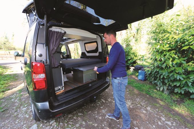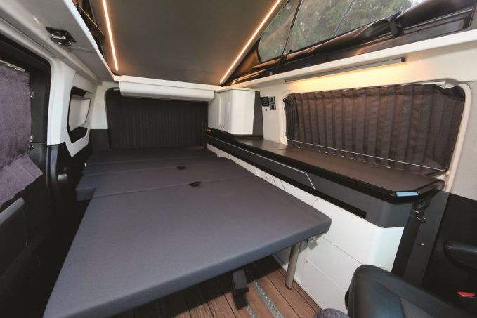 Le toit relevable abrite un lit pour deux affichant 115 x 192 cm. Le confort nocturne est assuré par un matelas reposant sur des assiettes Fröli. Dans l’habitacle, un ensemble matelas/sommier en trois parties s’installe sur les sièges arrière rabattus, constituant alors un deuxième couchage affichant exactement les mêmes dimensions que dans la chambre “à l’étage”.