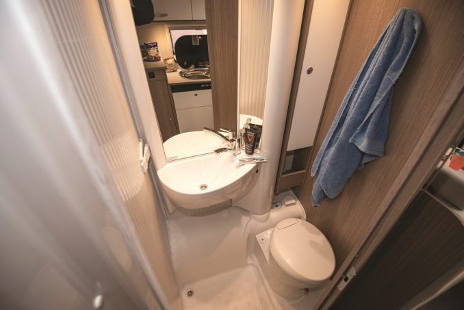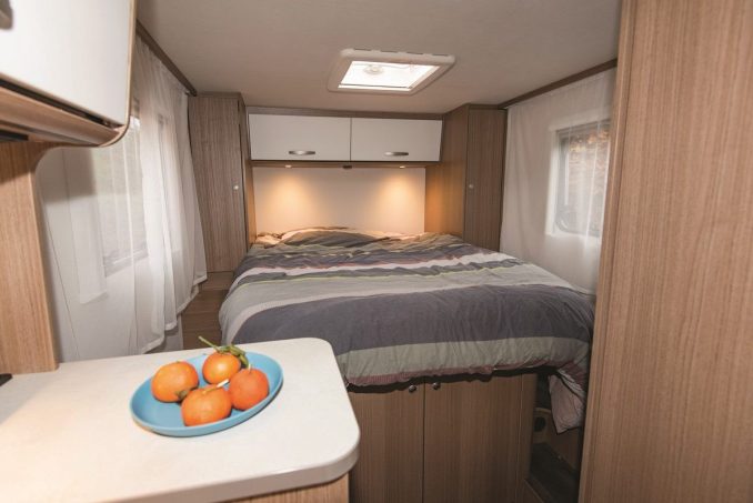 Malgré la relative compacité, ce profilé étroit dispose d’un lit central de 150 x 190 cm (avec 15 cm de rallonge de matelas). Lors du super essai de ce modèle, réalisé dans CCMag n° 338, nous avions été agréablement surpris par la bonne maîtrise de cet espace. La circulation autour du sommier est facile et le confort du lit est excellent. Pour la salle d’eau, Carado a choisi la solution de la paroi pivotante Vario Bad, permettant d’optimiser l’espace.