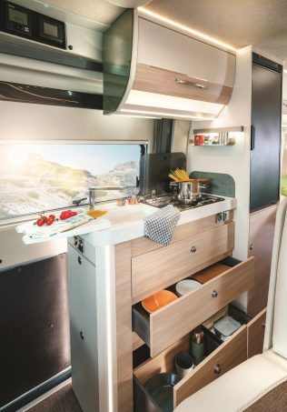 Etonnamment, le moteur est un 120 ch de série. Pour un modèle Premium, on aurait préféré un 140 ch – accessible en option, pour un bon millier d’euros en plus. En dehors de cela, nous avons apprécié tous les équipements. Comme le chauffage à carburant, la batterie auxiliaire au lithium-ion qui améliore l’autonomie électrique. Bon point aussi pour la cuisine, pratique et comprenant de grands rangements.