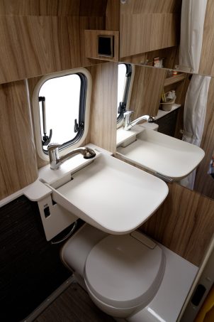 La chambre arrière abrite un lit transversal, mais la largeur intérieure du Mercedes – assez étroite – oblige Hymer CV à développer des ouïes latérales dans la carrosserie pour obtenir une dimension de 190 cm de long et 135 de large. Au catalogue des options, il est possible de profiter d’un couchage en pavillon grâce au toit relevable abritant sommier à lattes et matelas (122 x 200 cm).