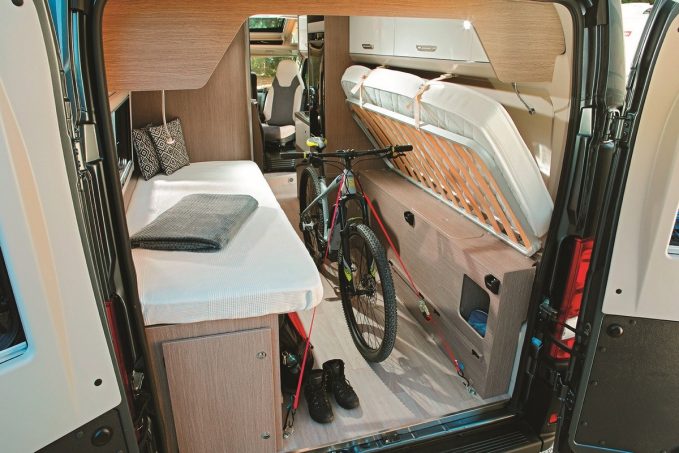 Avec cette “partie haute”, ce fourgon profite alors d’une chambre qui vient en complément des lits jumeaux logés en partie arrière, une des particularités du V217. En pavillon donc, le couchage double s’appuie sur deux matelas indépendants longitudinaux d’une dimension globale de 130 x 190 cm et reposant sur un revêtement isolant et respirant.