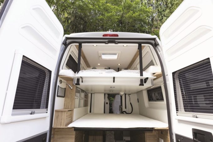 La rehausse du modèle sert surtout la partie couchage. En effet, Pilote peut loger un lit en pavillon au-dessus du garage (tendance forte du marché). Et pour se distinguer, la carte de la soute XXL : la hauteur intérieure est supérieure à celles des standards du marché. Le sommier est positionnable à deux niveaux. Des baies sont placées en partie supérieure. Le V633 M se destine à un usage à 4 grâce au couchage du bas, proposé en option. Dans ce cas, les lits forment des couchages doubles superposés.