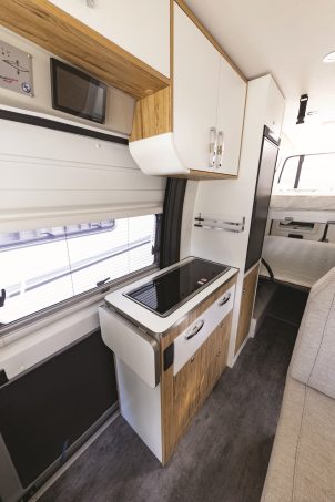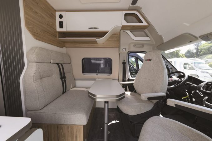 Avec son V633 M, Pilote utilise pour la première fois la version la plus haute du Fiat Ducato avec rehausse d’origine (H3). La hauteur est alors portée à 2,80 m générant une silhouette singulière au véhicule. Ce choix permet de profiter d’un salon très aéré avec découpe de la casquette. Le coin repas peut accueillir 4 personnes.