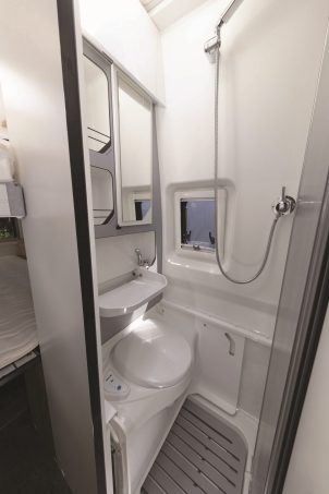 - Les points positifs : Douchette extérieure de série // Ambiance agréable // Tablette escamotable sous le frigo.