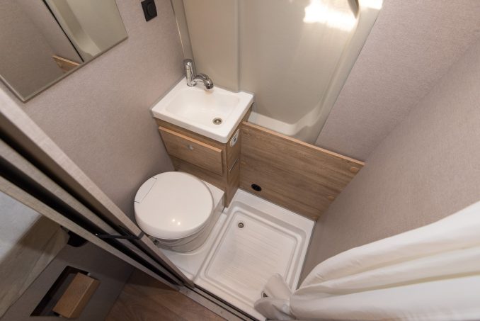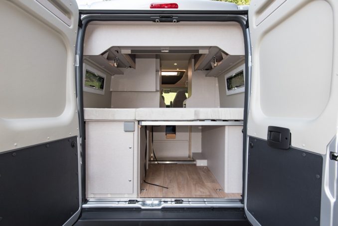 Placé à l’arrière, transversalement, le lit offre des dimensions honorables (130/140 x 196 cm) bien que son matelas perde 10 cm au pied, pour dégager plus de volume à la salle d’eau attenante. Le sommier en deux parties, dont une relevable sur le flanc droit, accroît la modularité de la soute. Pour minimiser les ponts thermiques, aucune baie n’est prévue sur les portes arrière. Globecar en monte juste deux petites de part et d’autre du lit. Pour accueillir éventuellement une troisième personne pour la nuit, un couchage d’appoint (70 x 196 cm), aménageable en dînette, est disponible. Sa mise en place demande un peu de pratique et son confort reste sommaire.