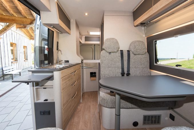 Malgré un prix contenu, ce modèle propose un intérieur plutôt qualitatif avec pas mal de rangements et d’astuces, comme un plan de travail repliable en bout de meuble de cuisine, de grands tiroirs avec frein de course. Mais la présentation comme le confort peuvent être améliorés, pour 1 900 €, en optant pour la finition Elégance, ici présentée. Elle apporte une touche plus cossue à l’habitacle avec une sellerie en tissu clair et un mobilier biton plus moderne. Pour accroître la charge utile de 200 kg, il est possible de commander son Globescout avec un PTAC porté à 3 500 kg (option).