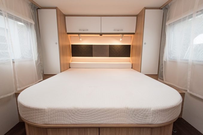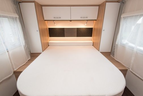 La partie arrière accueille la salle d’eau et la chambre, les mêmes que celles qui équipent le T69 L. On retrouve donc un vaste lit central de 151 x 190 cm, encadré à sa tête par deux penderies et deux placards de pavillon. Les dimensions du matelas sont plutôt correctes. Il est, par ailleurs, possible d’étirer la surface de couchage de 15 cm supplémentaires avec un rectangle de mousse. Mais au détriment du passage en bout de lit… En configuration classique, la largeur du couloir entre le sommier et les cloisons de la salle d’eau est de 27 cm. Si l’on installe l’extension de mousse, l’accès deviendra très étroit.