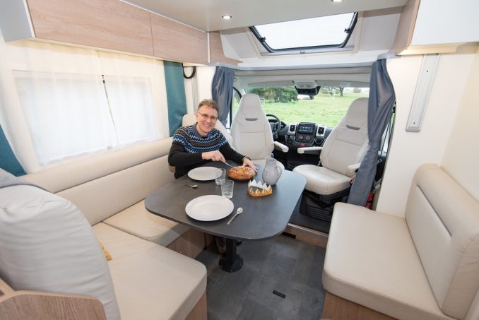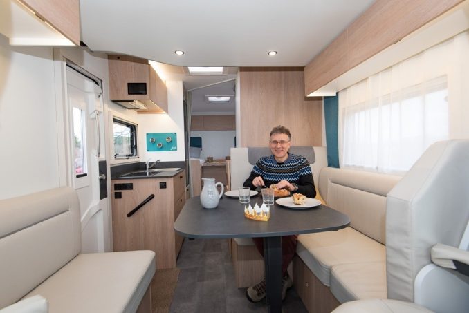 Que l’on opte ou pas pour le lit de pavillon et le lit en dînette, le salon offre une disposition fonctionnelle ainsi qu’une hauteur suffisante (190 à 210 cm). Pour le roulage, la banquette en L se transforme en un tournemain en deux assises, l’une face à la route et l’autre qui lui tourne le dos. Le sofa, à droite de la porte d’entrée, dissimule un coffre de rangement, toujours utile, ainsi que la console électrique du véhicule (batterie cellule, convertisseur…). On peut aussi compter sur les deux sièges cabine, à embases pivotantes, pour se retrouver à cinq ou six convives autour de la table. Dommage que son plateau ne puisse se replier pour rendre sa manipulation plus aisée.