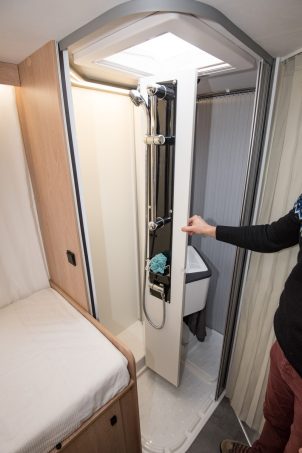 Le choix d’une version à lits séparés, plutôt qu’un lit central unique (70Q de 6,99 m ou 75Q de 7,39 m) est favorisé par la praticité d’un tel plan. Qu’il s’agisse de la version à lits jumeaux courte (70T de 6,99 m affichée à 53 900 €) ou plus longue (75T de 7,39 m) comme ici, cette disposition offre davantage de perspectives en termes de volume disponible et de rangements (lingère sous le lit droit - penderie sous le lit gauche). Disposer d’une table de nuit XXL, au centre, ou d’un couchage king size (219 x 195 cm) en installant des matelas d’appoints (158 x 73 cm) s’apprécie à tout âge. Ce choix pénalise également moins l’espace dédié à la salle d’eau. Le montage d’un cabinet de toilette 3-en-1, avec paroi de douche pivotante intégrant la vasque de lavabo, nous a franchement convaincus, même si la fermeture de la porte coulissante qui la cloisonne exige autant de délicatesse que de doigté.