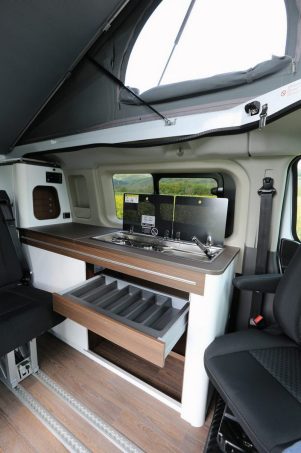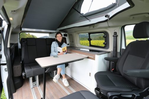 Sur la face interne du hayon, est fixé un sac pour entreposer la table pliante qui sert aussi bien à l’intérieur qu’à l’extérieur. Le prix de base du Kosmo Urban F100 est de 51 199 €. Une finition supérieure Urban+ est également proposée. On profite alors de la carrosserie Gris Millenium avec toit assorti, de la motorisation de 150 ch, de deux sièges individuels supplémentaires, d’un chauffage gasoil et des packs Urban Life et Electricité… La facture passe alors à 65 305 €.