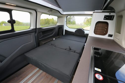 La banquette, dotée de deux ceintures de sécurité, coulisse sur un rail pour libérer du volume dans le salon ou dans le coffre. Elle se transforme en couchage de 91 x 187 cm. Un peu étroit pour deux personnes. Heureusement, un petit coussin latéral permet de l’élargir aux épaules pour atteindre une largeur de 110 cm.