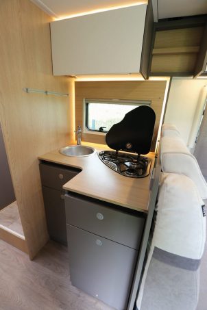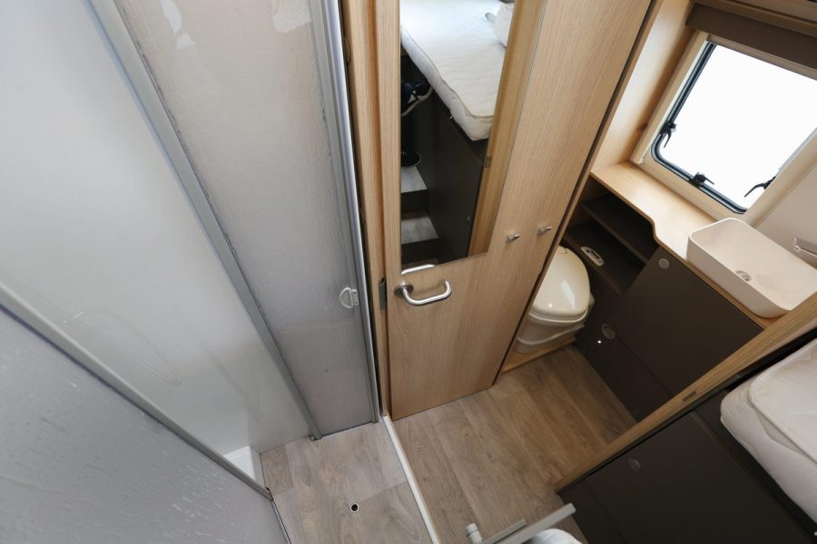 En bout arrière, ont été installés des lits jumeaux de 80 x 200 cm chacun. Une rallonge centrale de 167 x 50 cm permet, si besoin, de les réunir. Ces couchages se trouvent haut perchés pour disposer d’une vaste soute – 90 cm de largeur par 217 cm de profondeur et 114 cm de hauteur constante. Ils restent néanmoins facilement accessibles grâce à la présence d’un petit escalier. Le poste sanitaire est en deux parties. Le cabinet de toilette est indépendant de la douche. Ces deux zones ne peuvent hélas pas être réunies, malgré la porte à double emploi des WC.