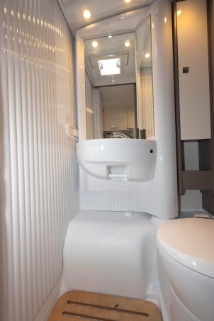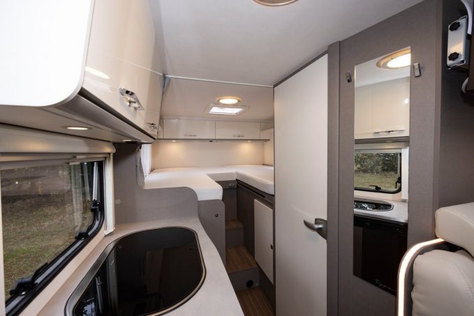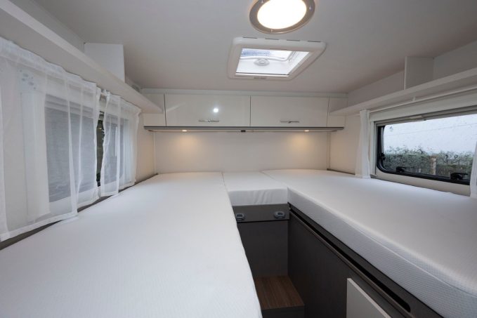 On ne change pas une formule gagnante en somme. Ainsi, en partie avant, on retrouve un salon pour quatre personnes avec banquette face route et sièges pivotants du poste de conduite. La hauteur sous plafond est en revanche plus importante que son “frère” sur Fiat. La chambre occupe la partie arrière et s’appuie sur des lits jumeaux pouvant être réunis de série en couchage double XXL. La cuisine est un peu petite et est dépourvue de plan de travail, ne serait-ce qu’amovible. Pour la France, la marque a décidé d’enrichir la dotation d’origine de ce profilé dans une version dénommée “Complete Selection”. Ce V 6.6 SF bénéficie donc des packs Type X, Châssis et Confort, d’un store extérieur, de la station et de la conversion lits jumeaux-grand couchage. Ce profilé étroit affiche un rapport prestation/prix convaincant avec un tarif de 61 990 €.