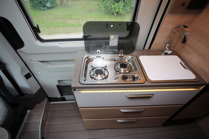 Le 680 ME bénéficie d’origine d’un équipement fourni : clim’ cabine manuelle, régulateur de vitesse, système de navigation, caméra de recul, marchepied électrique, moteur 177 ch, boîte automatique… Ceci expliquerait en partie son tarif même si quelques packs ou options peuvent encore se révéler indispensables pour disposer d’un confort absolu. Ce dernier s’apprécie en chambre grâce au montage de lits jumeaux de belles longueurs (208 cm côté cuisine et 197 cm côté salle d’eau) pour 78 cm de largeur et joignables par le centre.