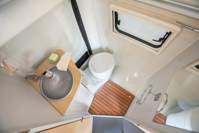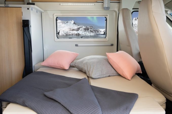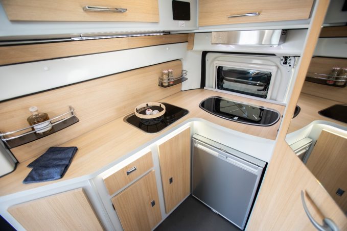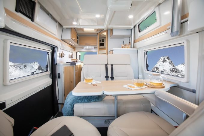 Avec plus de 20 ans d’existence, il est le plus ancien modèle commercialisé à ce jour. Evidemment, de nombreuses évolutions ont été apportées au fil des collections, mais l’esprit originel demeure, à commencer par sa ligne atypique due à sa rehausse de toit culminant sous la barre de 2,80 m de hauteur. Dans seulement 5,48 m, on profite d’un vaste salon pour 4, avec les sièges pivotant du poste de conduite et la banquette face route type automobile, et facilement convertible en lit d’appoint (122 x 190 cm). Cet ensemble est surmonté d’un lit de pavillon électrique (152 x 195 cm) logé dans le sens de la longueur. La partie arrière est réservée à la cuisine avec un vaste bloc en L. On apprécie le très grand plan de travail et les nombreux rangements sur ce poste. L’espace sanitaire est situé dans l’angle arrière gauche. Profitant d’une baie opaque, cette zone accueille lavabo, WC et douche.