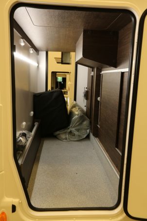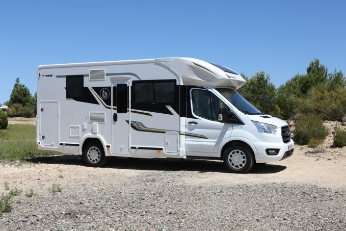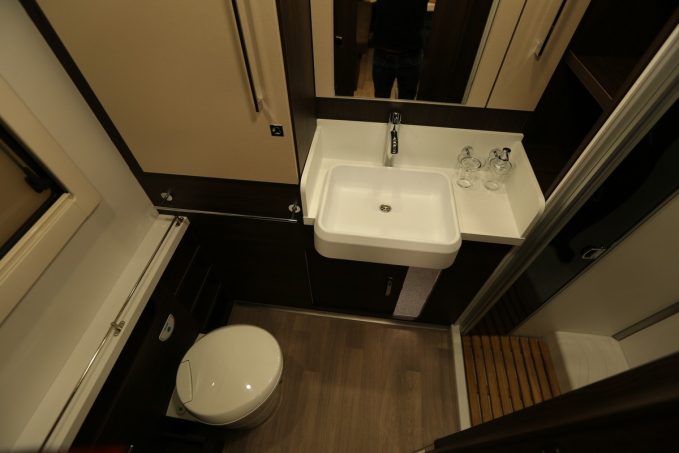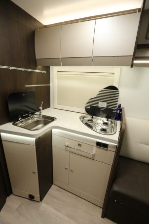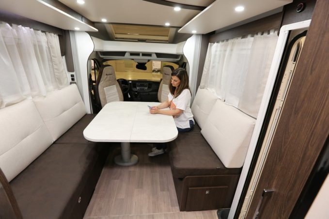 L’espagnol a en effet conçu ce poste pour profiter à la fois d’espace, mais surtout de vastes rangements. Ainsi, le lavabo central est surmonté d’un miroir derrière lequel on trouve un immense placard. Sous la vasque, un portillon laisse entrevoir un accès à la soute traversante dans laquelle tient aisément un vélo. A côté de cet ensemble, une profonde penderie coulissante vient parfaire ce beau tableau. L’autre atout de ce véhicule se trouve dans le salon. Les longues banquettes en vis-à-vis autorisent six personnes à prendre place autour de la table. Cette dînette est par ailleurs convertible en couchage double (135 x 190 cm), mais au confort moindre comparé à celui du lit de pavillon qui la surmonte. Doté d’un système électrique, il profite d’un matelas de 160 x 191 cm.