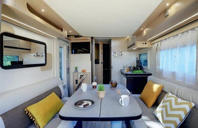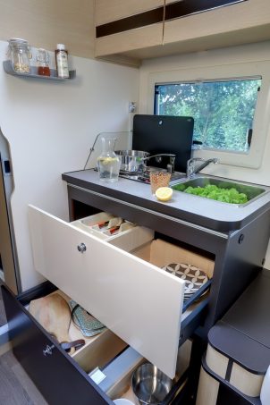 En effet, dans un camping-car d'à peine plus de 6 m, le constructeur Autostar est parvenu à loger un confortable salon lounge capable d’accueillir six personnes autour d’une vaste table. La cuisine est spacieuse, fonctionnelle, compte de multiples rangements et surtout un grand frigo de 141 l.