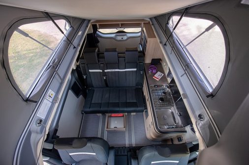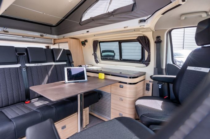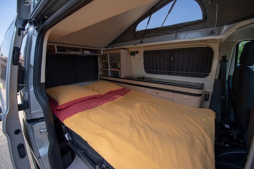 À l’intérieur, pas de superflu, chaque élément est à sa place. L’aménagement est fonctionnel et une attention particulière aux détails et aux finitions a été apportée. On retrouve donc une banquette 3 places montée sur rails, qui peut facilement être avancée ou reculée en fonction des besoins pour avoir davantage de place dans le coffre ou pouvoir disposer d’un plus grand espace de vie. La banquette est très facilement convertible en lit double (110 x 200 cm) et comporte un grand tiroir dissimulé sous l’assise.
