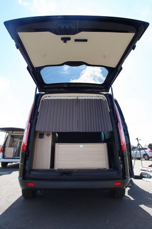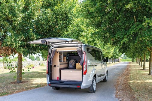 Au niveau des rangements, ce modèle surprend par son efficacité et sa compacité puisqu’il compte de nombreux placards et tiroirs sous le bloc-cuisine, sur le côté du lit, et même en hauteur à l’arrière du véhicule. Dans le coffre, il est possible d’ajouter (en option) une malle en bois amovible et compartimentée qui s’adapte parfaitement au coffre du véhicule et offre de belles possibilités de rangement.