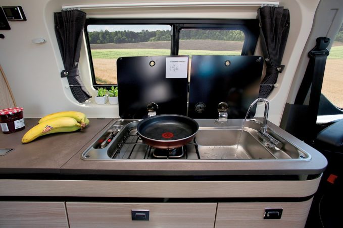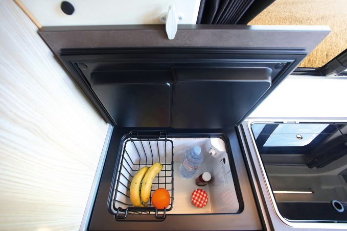 En termes de couchages, le Auckland dispose également d’un lit de toit de dimensions similaires (116 x 190 cm), monté sur un sommier Froli procurant un « effet lattes » pour un meilleur confort. En bas, on retrouve un bloc-cuisine équipé d’un évier avec mitigeur, d’un réfrigérateur à compression de 40 litres dissimulé sous le plan de travail, d’un réchaud à gaz 2 feux (bouteille 1,8 kg) et d’une table escamotable.