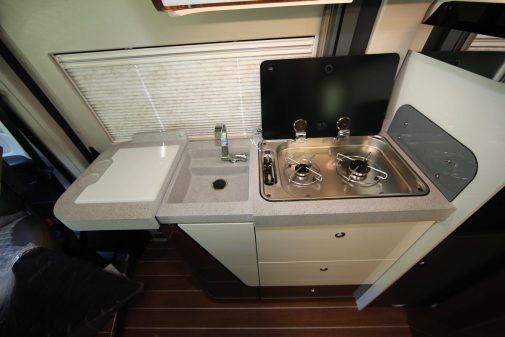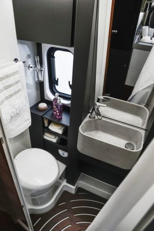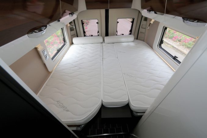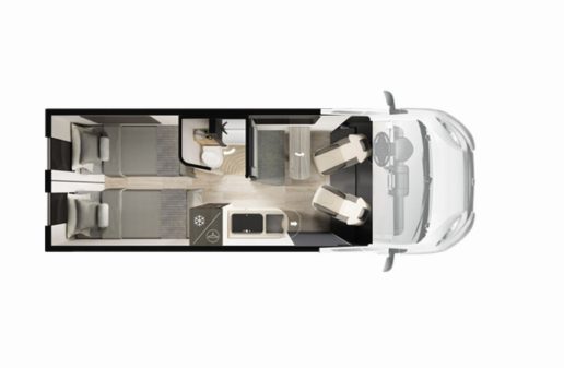 Sur cette version K 6.3, Mobilvetta Design propose des lits jumeaux (joignables par le centre) avec deux sommiers relevables pour transporter des vélos en soute. Leurs tailles inégales (195 x 80 cm à droite - 190 x 80 cm à gauche) sont la conséquence de l’aménagement d’une salle d’eau "3-en-1". Le lavabo, fixé sur une paroi mobile, se replie au-dessus des toilettes afin d’optimiser l’espace pour la douche. Le bloc-cuisine se révèle astucieux avec un plan de travail coulissant et un couvercle d’évier utilisable comme planche à découper.