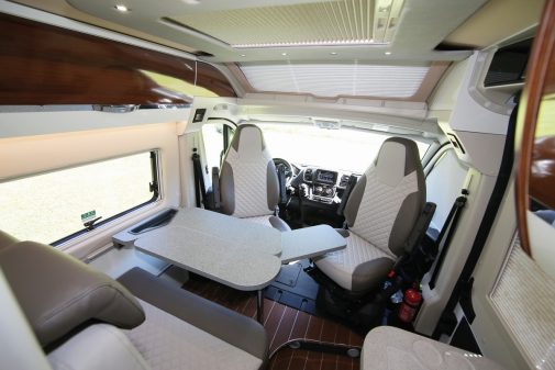 Dans le salon, la table peut s’utiliser de trois façons, selon le déploiement de son plateau et de sa rallonge. Le montage d’un skydome avec pare-soleil améliore la clarté. Rien ne manque, à l’exception d’une boîte auto (option).