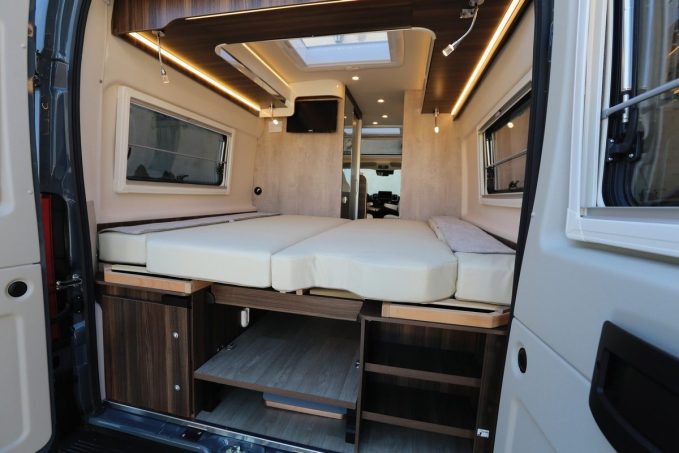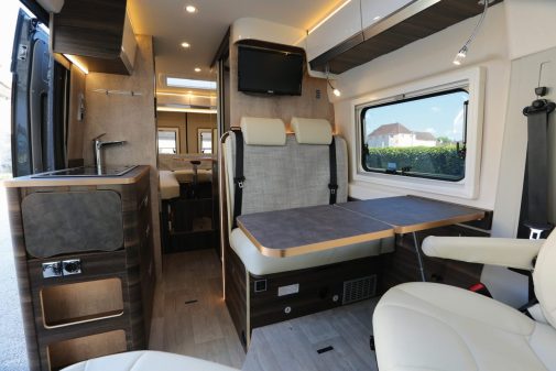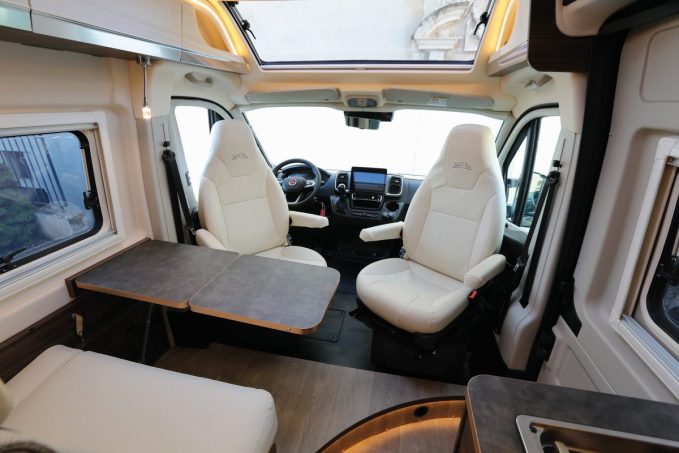 À l’étape, ce salon convivial se convertit en chambre. Là aussi, vous avez le choix entre une transformation en lits jumeaux ou en un grand couchage sur toute la largeur de l’habitacle (175 x 196 cm). Cette polyvalence est unique dans l’univers du fourgon aménagé. Par ailleurs, Laika a conservé un salon en partie avant avec table rabattable. Cela afin de disposer d’une banquette face route, idéale pour deux passagers.