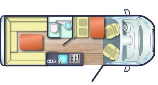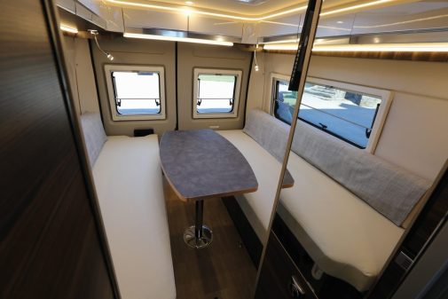 L’Ecovip 645 se distingue de ses concurrents par un plan pour le moins atypique pour un fourgon, et sa modularité. Laika a choisi comme agencement un grand salon arrière positionné contre les portes du fond offrant ainsi aux occupants une vue imprenable sur les alentours lorsqu’elles sont ouvertes. Cette dînette peut être configurée de différentes manières : soit en U, soit en vis-à-vis, selon les besoins et les envies. De larges baies latérales apportent aération et luminosité.