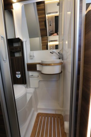 Dans la salle d’eau, le système Vario optimise l’espace. Il s’agit d’une cloison articulée qui transforme le compartiment en cabinet de toilette ou en cabine de douche. Le local est équipé d’une baie. Celle-ci autorise une bonne ventilation des lieux et permet de récupérer la douchette à l’extérieur pour se rincer au retour de la plage.
