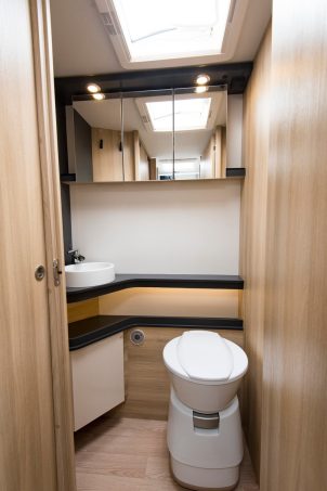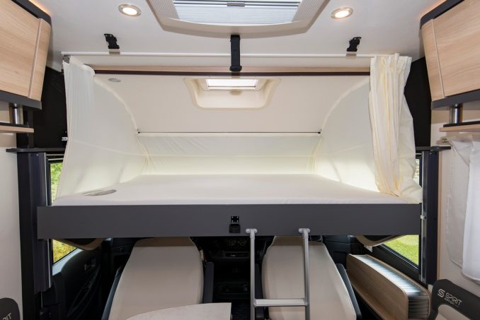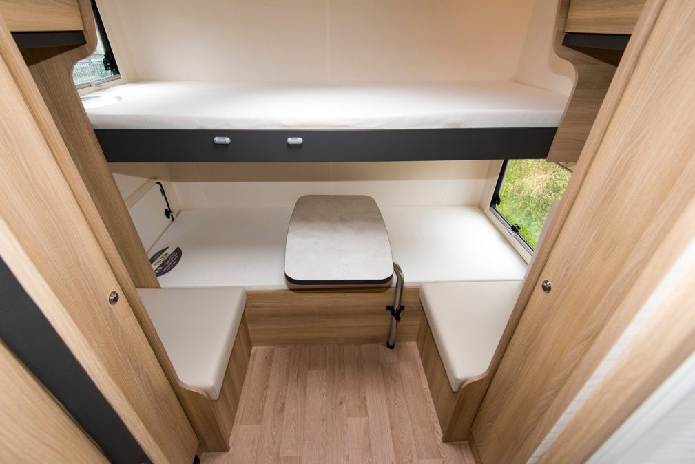 Itineo a toujours eu à coeur de se démarquer de la concurrence par des implantations originales... et souvent familiales. Le modèle à l'essai ici en est la parfaite illustration en prenant en considération le besoin d'intimité chez les enfants. Sur une longueur de 7,42 m, Itineo dédie toute la partie arrière à nos chérubins avec des lits superposés (81 x 217 cm) précédés d’un vrai coin salon intime et confortable. Cette zone est séparée de la “partie de vie” par un poste sanitaire, utilisable en transversal grâce à la porte double cloisonnement du WC et à celle à galandage de la cuisine.