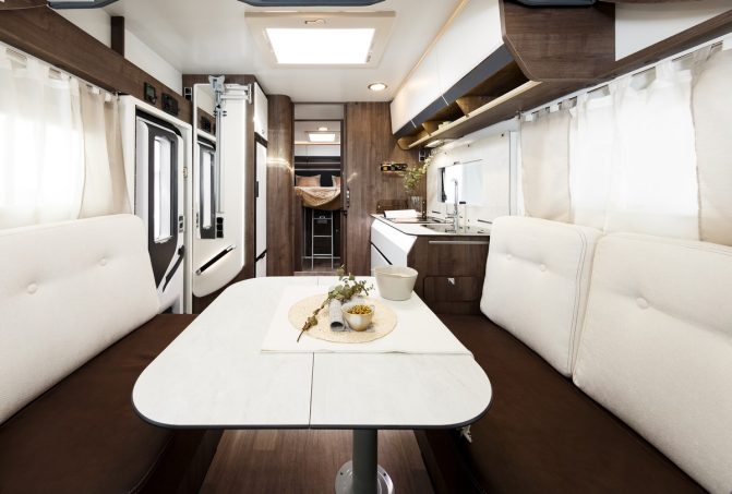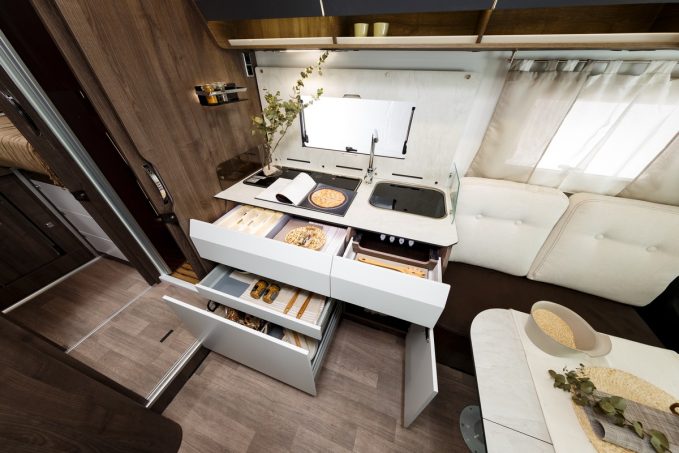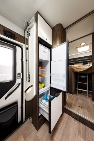 De nombreux rangements trônent sous le sommier, dont une vaste soute garage d’un volume supérieur à 2,60 m3. Le poste sanitaire est en deux parties qui peuvent être réunies transversalement. C’est la tendance actuelle du marché français, au même titre que le salon face-face en partie avant. Ce dernier offre d’ailleurs un espace impressionnant et une circulation extrêmement aisée. Sous les assises, deux sièges passagers homologués face route. L'habitacle est baigné de teintes tout en contraste, véritable identité visuelle des ambiances du constructeur espagnol depuis une dizaine d'années. Le mobilier fait preuve d'une belle modernité dans sa ligne.