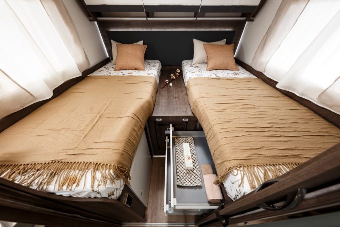 L'intégral de la marque Benimar se distingue des deux autres modèles qui composent cette gamme Amphitryon par la présence de lits jumeaux en chambre arrière. En effet, ce véhicule de 7,42 m de long embarque des couchages séparés (85 x 196 cm), avec les matelas pouvant être associés grâce à une rallonge prévue pour former un lit XXL (170 x 210 cm). Le confort est réel avec, en prime, un matelas de bonne épaisseur.