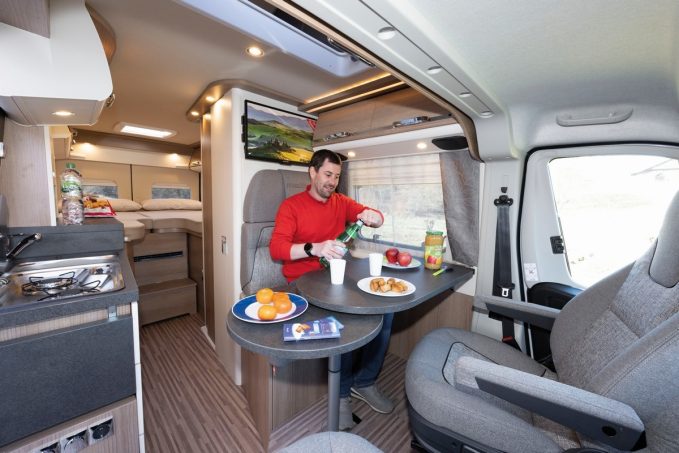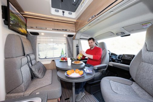 En résumé, ce fourgon affiche une belle prestation par son ambiance soignée et son mobilier de belle facture. Le 640 LE K est ici en configuration Diversity, ce qui signifie, chez Malibu, qu’un soin est apporté au traitement de la cuisine : un grand plan de travail au-dessus du frigo (trop petit) et de nombreux rangements. La salle d’eau qui lui fait face affiche un caractère innovant grâce aux WC coulissants dans la paroi.