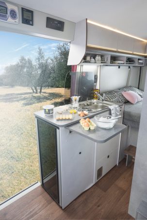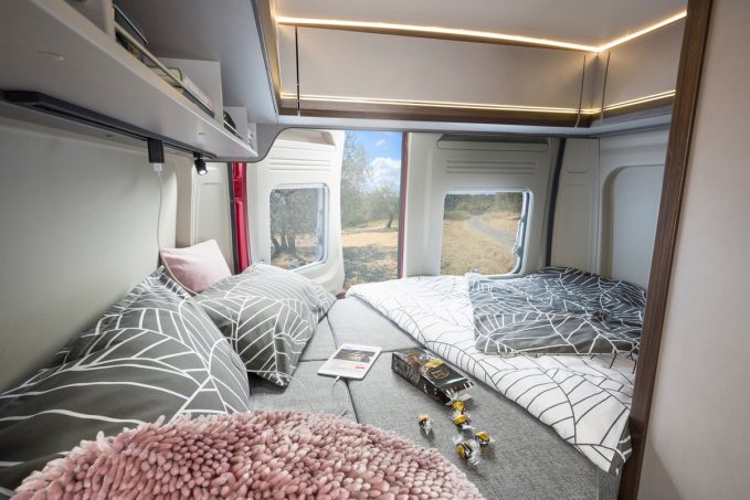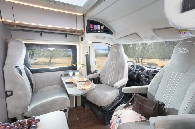 De son côté, le système Multiroof permet de profiter d’une cabine ouverte ou d’un rangement au-dessus du poste de conduite. Il s’agit d’une tablette réglable et amovible qui, cette année, a reçu un système de verrouillage optimisé et un filet de retenue de la charge. Par ailleurs, l’implantation reste classique : lit transversal arrière, meuble de cuisine à l’entrée, avec réfrigérateur en bout de meuble à double ouverture. Bon point pour l’ambiance exclusive, contemporaine et moderne.