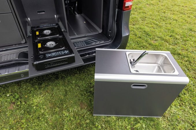 Pour plus de confort, la marque allemande propose en option sa CampBox. Il s’agit d’un ameublement logé dans le coffre qui se compose d’un bloc-cuisine avec réchaud deux feux et évier ainsi que de quelques tiroirs de rangements. Le matelas qui vient également en complément autorise la conversion de la banquette arrière en un lit double supplémentaire. Les CampBox sont fabriquées en aluminium recouvert de bois stratifié. Le système Quick-Fix permet d’installer et de retirer très facilement l’ensemble, pour être remisé lorsqu’il n’est pas utilisé. A noter que ce modèle est également disponible sur la base “plus utilitaire” du Mercedes Vito, permettant d’abaisser la facture.