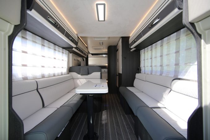Si la porte d’entrée est aménagée à l’extrémité arrière droite, c’est pour permettre l’installation d’un vaste salon à deux banquettes en long. A la nuit tombée, elles se transforment en deux couchages individuels (216 x 100 cm). Un grand lit (190 x 133/124 cm) à commande électrique reste aussi disponible dans le pavillon.