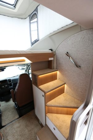 Présenté il y a déjà deux ans, le Lyseo Gallery TD Harmony 649 G figure désormais au catalogue Bürstner. Il se distingue d'entre tous par sa casquette relevable. En un peu plus de 120 secondes, celle-ci se relève grâce à une grosse ceinture gonflable, créant ainsi une chambre (accessible par un escalier). On peut y passer la nuit, y compris lorsque le mercure chute. Bürstner a réalisé des tests en chambre climatique pour mettre à l’épreuve l’isolation des parois. L’ensemble a résisté à une amplitude de 110 °C (de – 30 à + 80 °C). Même le poids de la neige ne fait pas s’affaisser la casquette, laquelle s’abaisse en 3 minutes.