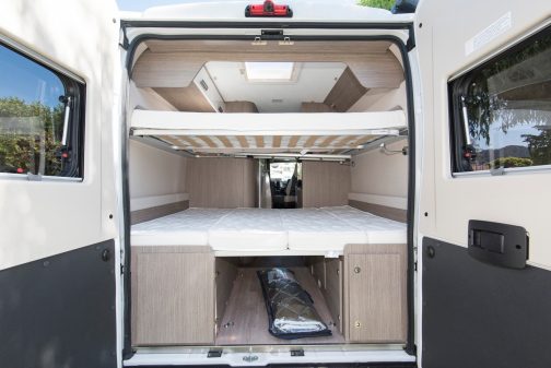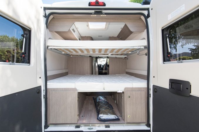Long de 5,99 m, ce fourgon Challenger profite en chambre arrière de lits doubles superposés. Quatre personnes donc, même si la logique (et le tirant d’air en partie haute) laisse supposer l’utilisation du couchage haut par des enfants. Le sommier est cependant amovible.