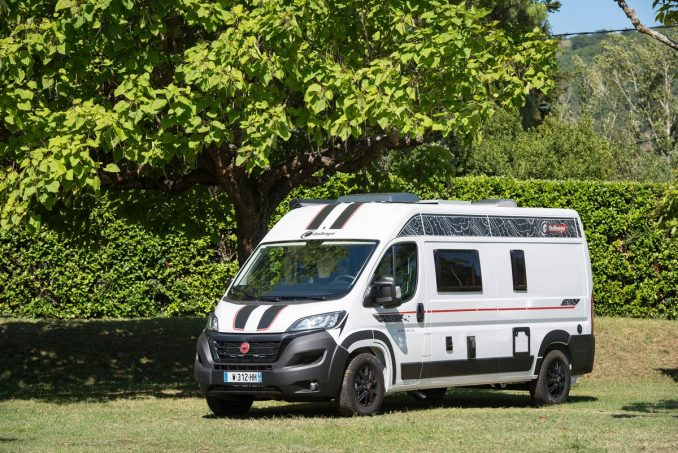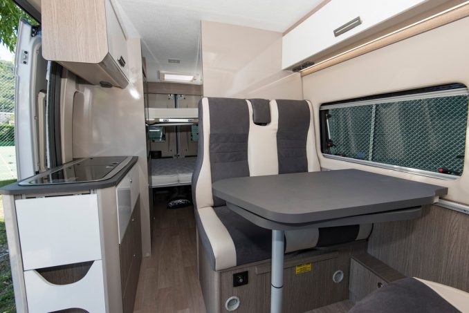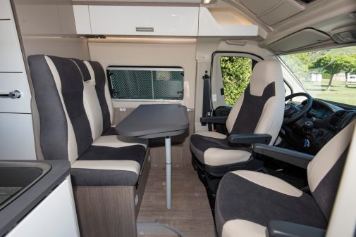 La partie avant se compose d’une banquette face route et des sièges pivotants. L’ensemble est associé à une table avec rallonge. De base, ce véhicule profite d’une découpe de cabine garante d’un bel espace sur ce poste. La partie cuisine dévoile une belle capacité de rangement et le plan de travail rétractable, une certaine modularité. A noter enfin la présence d’un frigo de 84 l, un peu juste pour un programme familial. La salle d’eau, pour sa part, ne dispose malheureusement pas de cloison pivotante.