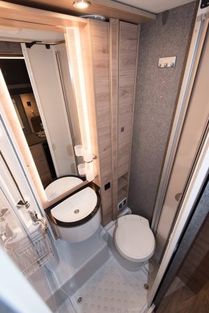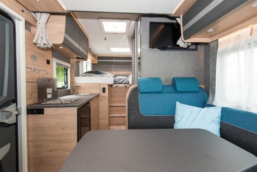 Bien vu, le cabinet de toilette Vario, qui permet d’installer rapidement un espace pour la douche. L’ambiance intérieure (sellerie Salerno et mobilier Noyer de Nogano) ne manque pas de charme. La présence d’une porte de cellule de 70 cm ne pénalise pas trop le bloc-cuisine qui intègre aussi le réfrigérateur.