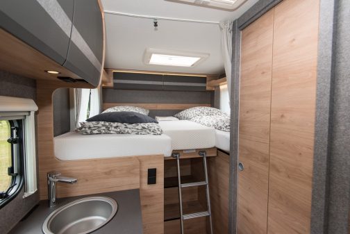 Le Just Go fait partie d’une nouvelle famille de profilés Dethleffs, sur porteur Ford, qui se veut financièrement intéressante tout en offrant un équipement décent. Le T6615 EB se démarque par son gabarit raisonnable (6,69 m de long), qui n’interdit pas le montage de lits arrière séparés. De largeurs identiques (80 cm), les matelas affichent 198 cm de long, côté salle d’eau, pour 202 cm, côté cuisine. Positionnés au-dessus de la soute garage, leur accès est facilité par deux marches (ou une échelle en configuration king size avec matelas complémentaire).