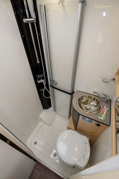 Malheureusement, nous ne pouvons pas nous montrer aussi enthousiastes pour la partie sanitaire. Le compartiment unique est, certes, bien dimensionné. On y trouve un WC à tête pivotante et un lavabo, mais le système de séparation qui permet de créer la cabine de douche (55 x 67 cm aux épaules) oblige à manipuler plusieurs battants. Un bon point tout de même pour le passage de roue qui empiète très peu sur le receveur. L’autonomie en eau est assurée par un réservoir de 120 l (105 l pour les eaux usées). L’eau chaude et le chauffage sont produits par un combiné Truma de 4 000 W.
