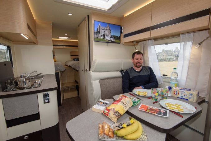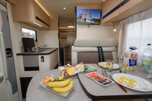 Autostar a mis à notre disposition un profilé élaboré avec la configuration la plus vendue. Autrement dit avec la motorisation de 170 ch, la boîte automatique à 6 rapports et le pack Performance. Cet ensemble optionnel, facturé 5 280 €, comprend un panneau solaire de 120 W, un régulateur à haut rendement, des rideaux d’occultation de la cabine, un store extérieur de 3 m, une antenne satellite, une TV de 21,5 pouces et un combiné multimédia à écran tactile Zenec couplé à la caméra de recul.