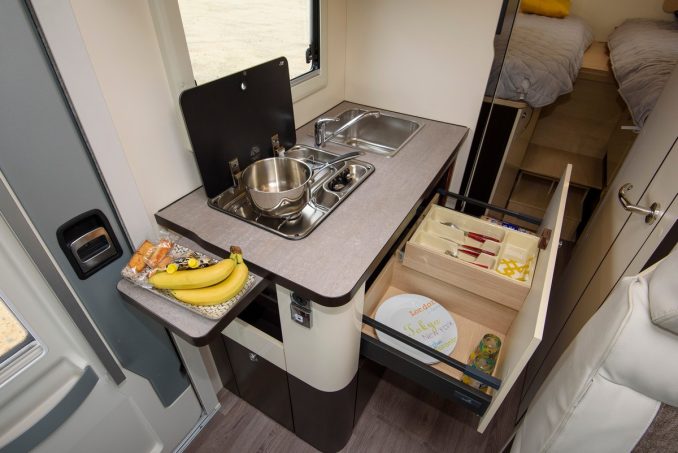 Le bloc-cuisine, positionné à gauche de la porte d’entrée, s’étend jusqu’à la chambre, avec un réfrigérateur de 137 l servant de séparation. Le meuble intègre un évier en Inox carré de 14 cm de profondeur (suffisant pour laver des assiettes et une poêle) ainsi qu'un réchaud 2 feux. De profonds tiroirs et sous-tiroirs s’avèrent très pratiques pour ranger couverts, assiettes et boîtes de conserve. La surface du plan de travail peut s’étendre grâce à la tablette escamotable installée sur la gauche du meuble.