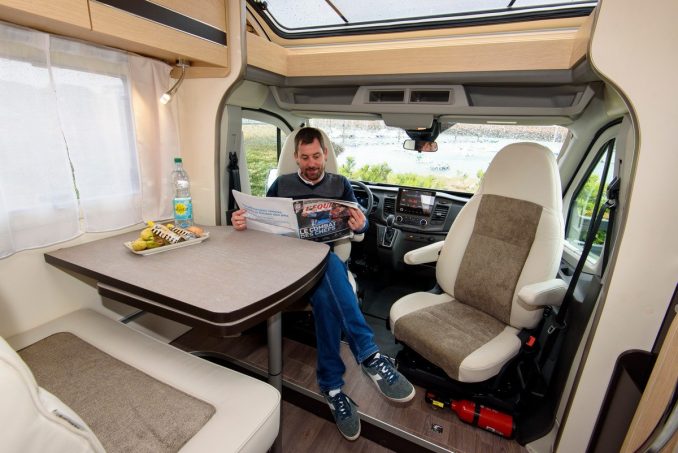 La montée à bord s’effectue par une large porte équipée, de série, d’une baie et d’une moustiquaire. Le marchepied électrique facilite l’accès, réduisant la hauteur élevée du seuil. On pénètre alors dans un vaste salon. Celui-ci se compose d’une banquette face route pour deux personnes, et dotée de ceintures de sécurité, et des sièges pivotants de la cabine. Faire tourner les sièges du Ford Transit est encore et toujours un exercice compliqué, puisqu'il faut avancer et reculer plusieurs fois les assises, voire ouvrir les portières pour éviter que les dossiers n’y buttent. Les gens de chez Ford ne semblent toujours pas avoir pris la mesure de ce problème, agaçant au quotidien. Sinon, le coin repas donne entière satisfaction. La table étonne même par sa largeur de 63,50 cm ; son plateau est associé à une rallonge pivotante qui augmente considérablement sa surface.