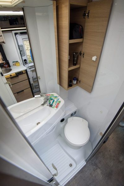 Dans le compartiment sanitaire, Chausson exploite le même système Vario que celui qui se trouve dans la salle d’eau des profilés de la série S (sur Ford Transit). Le cabinet de toilette peut ainsi se transformer en douche, en faisant pivoter simplement une paroi articulée. Un système éprouvé qui permet d’optimiser l’espace. D’ailleurs, sur le registre gestion de l’espace, le X650 est épatant, compte tenu de son gabarit (6,36 m de long).