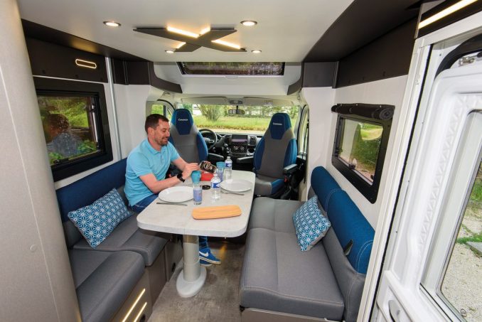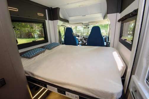 Car le X650 est un quatre places carte grise. La disposition des banquettes crée une belle sensation d’espace malgré l’étroite largeur intérieure (inférieur à 2 m) et une hauteur sous pavillon réduite à 1,89 m à cause du lit, couchage principal du véhicule. Animé par un moteur électrique, celui-ci s’abaisse rapidement et dévoile un matelas de 140 x 190 cm. Pour un usage à deux, il faut l’abaisser à son plus bas niveau pour en faciliter l’accès. Mais si l’on voyage à quatre, on placera le lit à mi-hauteur pour profiter du lit de dînette de 140 x 190 cm (74 cm sous barrot).