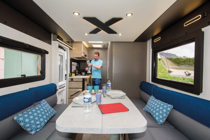 Toutefois, pour se démarquer de ce secteur, le constructeur avance plusieurs arguments chocs, dont l’habitabilité remarquable du véhicule et les innovations dont il est bardé. Au niveau de l’implantation, rien à redire. Une fois franchie la porte de la cellule, on accède à un vaste salon muni de banquettes latérales en vis-à-vis, des sièges de cabine pivotants et d’une table centrale. Rien d’extraordinaire… A priori, il s’agirait du même living que celui du premier X. Mais en y regardant de plus près, on constate qu’une évolution majeure a été apportée. En effet, une baie latérale a été intégrée sur le côté droit (à côté de la porte cellule). Cette ouverture apporte de la lumière naturelle et offre une vue dégagée sur l’extérieur, notamment pour le passager arrière durant les phases de roulage.