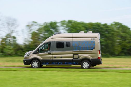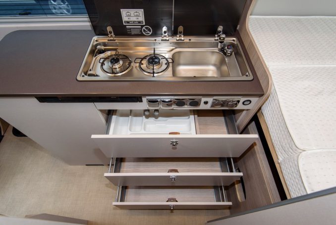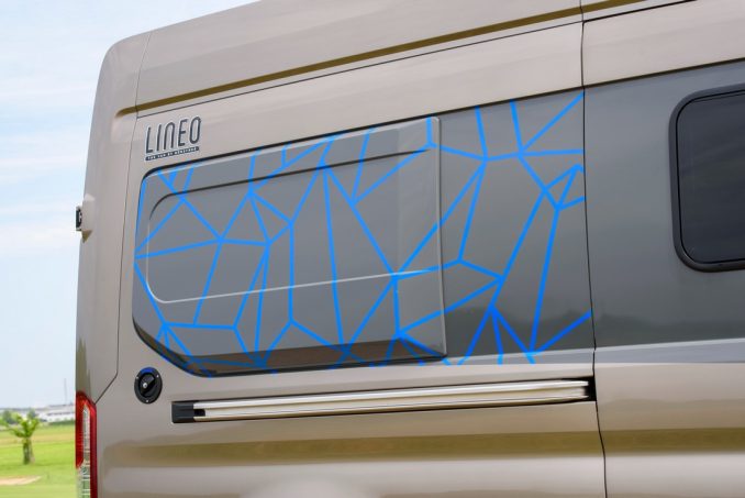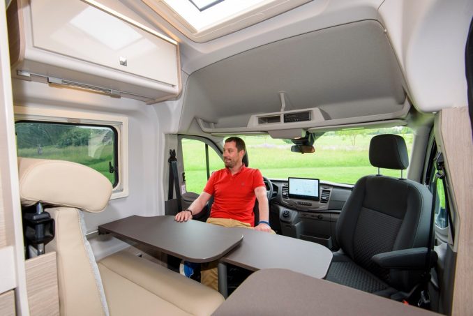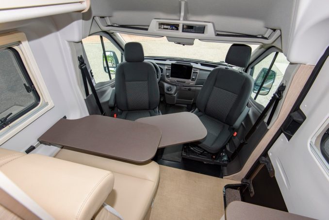 A bord, ce Lineo 590 Electric loge en partie arrière un couchage double dont le sommier peut se relever pour libérer la hauteur en soute. La salle d’eau bénéficie d’un WC, d’une douche isolée par un rideau et d’un lavabo. Ce dernier bénéficie d’un surprenant plan de travail obtenu grâce à une penderie accessible depuis le couloir. La cuisine reste fonctionnelle avec un réchaud deux feux, un évier et un réfrigérateur à compression de 70 l. Le salon est situé à l’avant et profite d’une confortable hauteur sous plafond offerte par le gabarit du porteur Ford Transit.